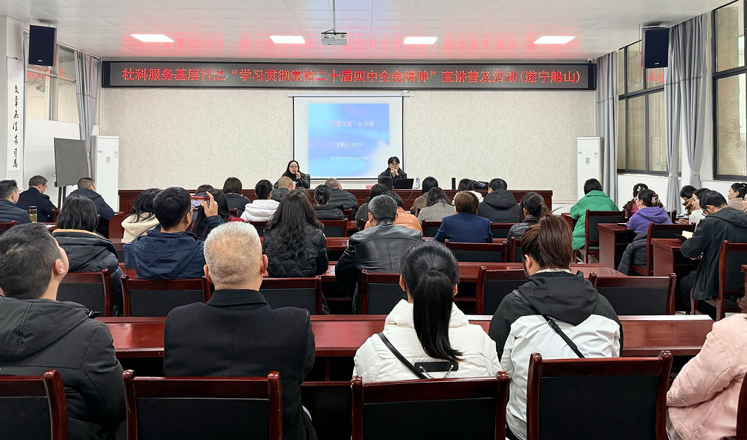 2025年12月10日,遂宁市船山区举行社科服务基层行之“学习贯彻党的二十届四中全会精神”宣讲普及活动。活动由四川省社科联组织专家开展,我院青年教师、四川历史名人文化普及基地专职研究员吴艾坪博士应四川省社科联之邀出席活动并作专题讲座。讲座由船山区社科联主席王孜主持,船山区各街道代表及学校教师代表参加宣讲会。