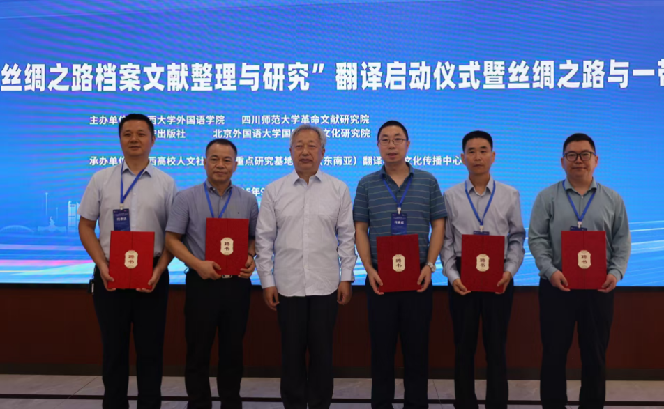 2025年9月13日,国家社科基金重大项目“太平洋丝绸之路档案文献整理与研究”翻译启动仪式暨“丝绸之路”与“一带一路”译丛学术研讨会在广西大学举行。会议由广西大学外国语学院、四川师范大学革命文献研究院、重庆出版社和北京外国语大学国际中国文化研究院等联合主办,来自全国十余所高校和出版机构的40余位专家学者参会。