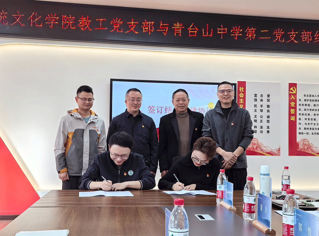 为推动中华优秀传统文化传承与基础教育深度融合,强化党支部战斗堡垒作用,2025年11月19日下午,四川师范大学中华传统文化学院教工党支部与四川师范大学附属青台山中学第二党支部结对共建签约仪式在青台山中学举行。学院党总支书记阳家全、副院长王勇及教工党支部、研究生党支部支委成员和党员代表参加会议。四川师范大学附属青台山中学全体领导班子成员及党员代表参加会议。会议由四川师范大学附属青台山中学副校长、第二党支部书记何畅主持。
